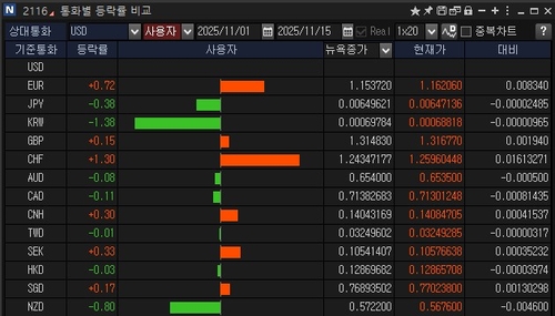 17일 연합인포맥스 통화별 등락률 비교(화면번호 2116)에 따르면 원화는 이달 들어 달러화 대비 1.38% 하락했다.