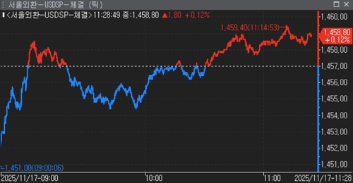 17일 서울 외환시장에서 달러-원 환율은 오전 11시28분 현재 전장대비 1.80원 상승한 1,458.80원에 거래됐다.