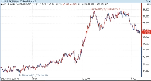 달러-엔은 뉴욕 오전 10시께 155엔 위로 올라오며 상승 곡선을 이어가고 있다. 장중 최고가는 155.304엔이다.