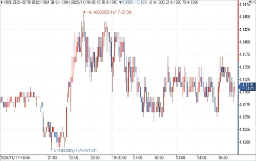 연합인포맥스의 해외금리 일중 화면(화면번호 6532)에 따르면 17일(미국 동부시간) 오후 3시 현재 뉴욕 채권시장에서 10년물 국채금리는 직전 거래일 오후 3시 기준가 대비 1.60bp 내린 4.1320%에 거래됐다.