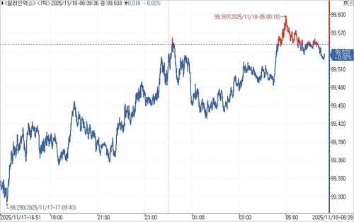달러인덱스(DXY)는 전장 98.278보다 0.272포인트(0.274%) 상승한 99.550을 나타냈다. 달러인덱스는 유럽 거래에서 99.3 부근까지 밀린 뒤 꾸준히 오름세를 탔다.