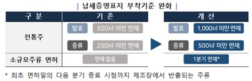 소규모 주류 제조자의 주류는 최초 면허일의 다음 분기까지 납세증명표지 부착 의무를 면제해 연간 약 90여개의 신규 업체가 납세협력 비용을 감축할 수 있도록 지원한다.