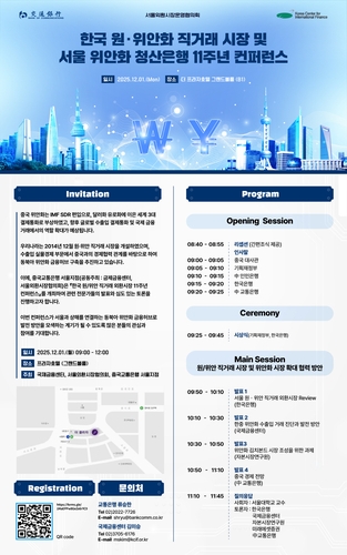 18일 국제금융센터에 따르면 국제금융센터, 서울외환시장협의회, 중국 교통은행 서울지점은 오는 12월 1일 오전 더 플라자호텔에서 '한국 원-위안 직거래 시장 및 서울 위안화 청산은행 11주년 기념 컨퍼런스'를 개최한다.