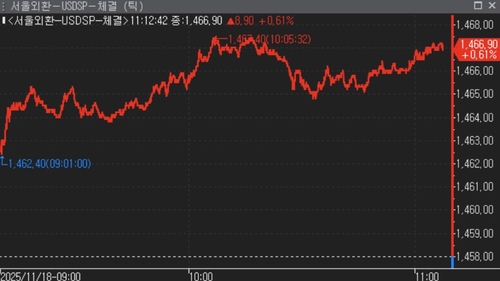 18일 서울 외환시장에서 달러-원 환율은 오전 11시12분 현재 전장대비 8.90원 오른 1,466.90원에 거래됐다.