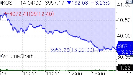 (서울=연합인포맥스) 송하린 기자 = 코스피가 기관과 외국인의 매도세에 밀려 7영업일 만에 4,000선을 재차 내줬다.