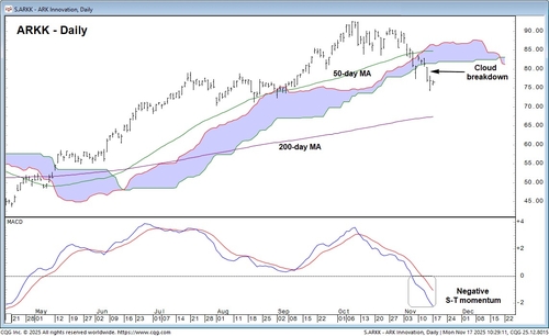 또 아크 이노베이션 ETF는 지난주 차트상 구름대가 있는 지지선을 하향 돌파해 새로운 약세 신호를 보냈으며 단기 MACD도 강력한 음(-)의 모멘텀을 나타내고 있어 하락이 끝날 신호가 아직 없다고 그는 분석했다.(그림1 참조)