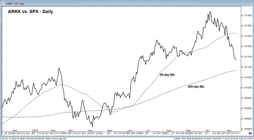 아크 이노베이션 ETF와 스탠더드 앤드 푸어스(S&P) 500 지수의 상대 성과 비율(ARKK/SPX Ratio)도 지난 9월 고점을 찍은 이후 급격히 하락했다.(그림2 참조)
