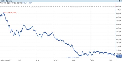18일 코스피는 전장보다 135.63포인트(3.32%) 내린 3,953.62에 마감했다. 종가 기준 지난달 24일(3,941.59) 이후 가장 낮은 수준이다.