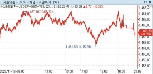 18일 외환시장에서 달러-원 환율은 오후 9시 50분 현재 전장 대비 5.70원 상승한 1,463.70원으로 나타났다.