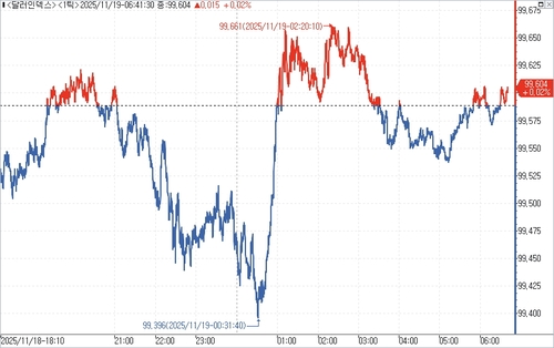 달러인덱스(DXY)는 전장 99.550보다 0.038포인트(0.038%) 상승한 99.588을 나타냈다. 달러인덱스는 한때 99.396까지 밀린 뒤 위쪽으로 방향으로 틀었다.