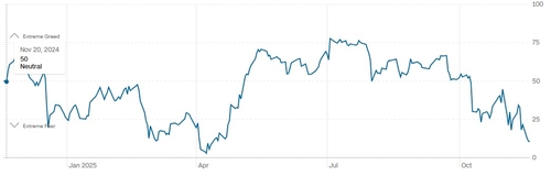 공포와 탐욕지수는 1주일 전 34로 '공포'(Fear) 상태였으나 최근 시장 변동성이 커지면서 극단적 공포 상태로 내려갔다.