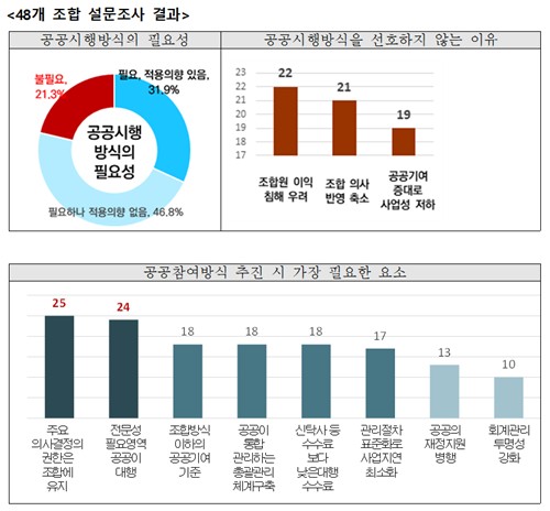 설문에서 공공방식 적용을 선호하지 않는 이유로 응답자의 45.8%는 조합원 이익 침해 우려를 답했다. 43.7%는 조합원 의사 결정권 축소 문제를, 39.6%는 공공기여 증가로 인한 사업성 저하 문제를 지적했다.
