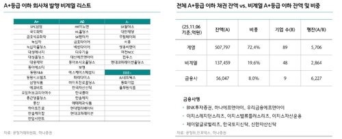 하나증권에 따르면 발행어음과 IMA 투자대상인 회사채 하위등급 중 상호출자제한계열사 물량은 제외된다. 비계열사의 경우 평균 발행잔액이 계열사의 50% 수준이며, 기업 수도 2분의 1 수준이다. 전체 발행잔액과 비중이 크지 않은 셈이다.
