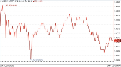 개장 직후 1,467.50원에서 고점을 찍은 환율은 이후 1,465~1,467원 범위에서 매우 좁게 횡보하고 있다.