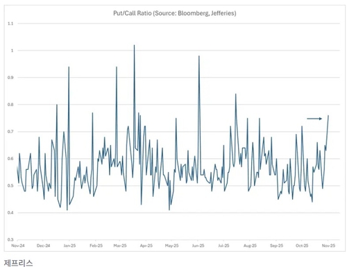 제프리스는 먼저 S&P 500의 콜옵션 대비 풋옵션의 비율이 최근 몇 달간 가장 높았으며, 이는 투자 심리가 이례적으로 약세에 쏠렸다는 것을 시사한다고 설명했다. 이 비율은 지수에 대해 매수된 풋옵션(본질적으로 투자자를 하방 위험으로부터 보호)과 매수되고 있는 콜옵션(투자자가 상승 움직임으로부터 이익을 얻게 하는 옵션)을 비교해 측정한다.