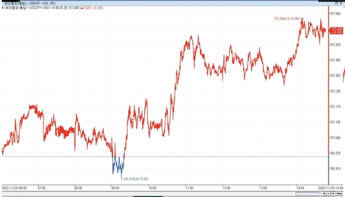 달러-엔 환율은 오전 장 중반까지 상단이 제한되는 모습이었지만 오전 11시가 조금 지난 시각 0.32%까지 오름폭을 확대해 한때 157.469엔을 기록했다. 이는 지난 1월 이후 약 10개월 만의 최고치다.