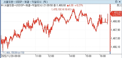 정규장 이후 런던장과 뉴욕장에서는 달러-원 환율이 소폭 더 오르면서 1,470원 턱 밑에서 거래 중이다.