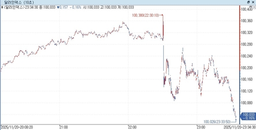 연합인포맥스(화면번호 6411)에 따르면 20일 오전 9시 32분 현재(이하 미 동부시간) 뉴욕 외환시장에서 주요 6개 통화에 대한 달러 가치를 반영하는 달러인덱스(DXY)는 100.054로 전장 마감 가격(100.190)보다 0.136포인트(0.136%) 하락했다.