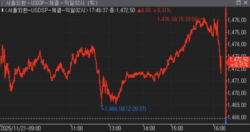 21일 외환시장에서 달러-원 환율은 오후 5시46분 현재 전장 대비 4.60원 상승한 1,472.50원에 거래됐다.