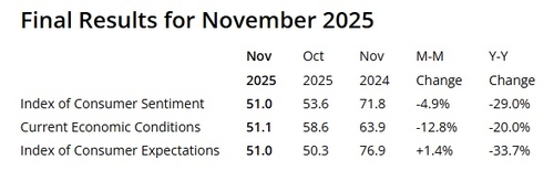 26일(현지시간) 미시간대에 따르면 11월 소비자심리지수 확정치는 51.0으로 전달(53.6) 대비 2.6포인트 하락했다.