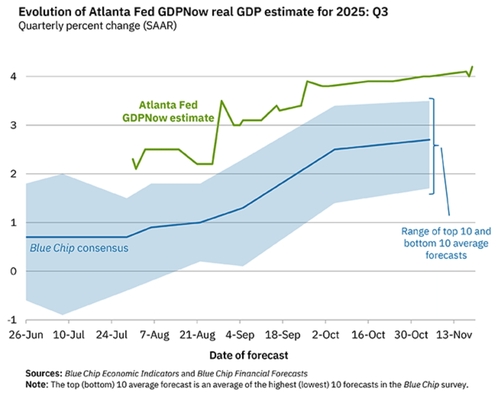 애틀랜타 연은은 역대 최장기간을 기록한 미 연방정부의 셧다운(일시적 업무정지) 여파로 한동안 민간기관의 데이터에 의존해 모델을 업데이트하다가 이달 17일부터 공식 경제지표를 다시 반영하기 시작했다.