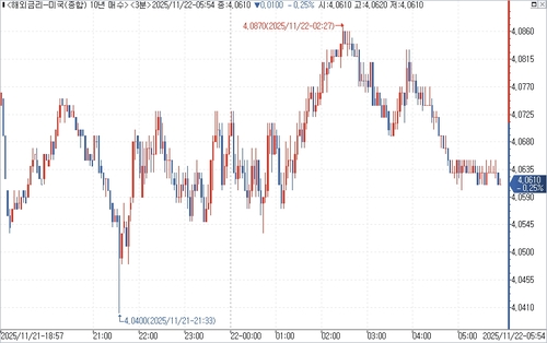 연합인포맥스의 해외금리 일중 화면(화면번호 6532)에 따르면 21일(미국 동부시간) 오후 3시 현재 뉴욕 채권시장에서 10년물 국채금리는 전 거래일 오후 3시 기준가 대비 4.20bp 내린 4.0630%에 거래됐다.
