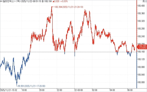 주요 6개 통화 대비 달러화 가치를 보여주는 달러인덱스(DXY)는 전장 100.251보다 0.094포인트(0.094%) 하락한 100.157을 나타냈다. 유럽 거래에서 99.989까지 밀리기도 했으나 유로존의 경기지표가 예상보다 약간 부진하게 나오자 100선을 금세 회복했다.