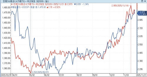 지난주(11월17일~21일) 국고채 3년물 금리(민평금리 기준)는 일주일 전보다 8.2bp 하락한 2.873%, 10년물 금리는 5.5bp 내린 3.275%를 나타냈다.