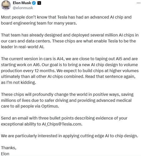 그는 "이 팀은 이미 수백만 개의 인공지능(AI) 칩을 설계하고 테슬라의 자동차와 데이터센터에 적용했다"고 밝혔다.
