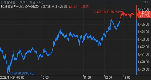 24일 서울 외환시장에서 달러-원 환율은 오후 1시37분 현재 전장대비 0.70원 오른 1,476.30원에 거래됐다.