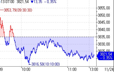 상하이종합지수는 전장보다 0.34% 밀린 3,821.68에 오전장을 마감해 지난 10월 13일 이후 최저치를 기록했다.