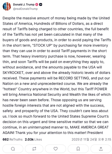 트럼프 대통령은 "이미 미국은 세계에서 가장 멋진 나라지만, 이러한 관세 파워는 미국을 과거에 본 적 없는 수준의 국가 안보와 부를 가져다줄 것"이라고 부연했다.