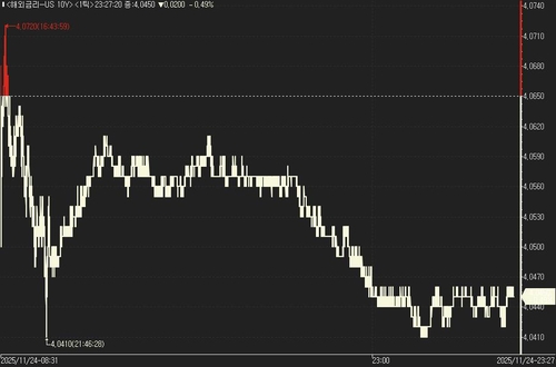 연합인포맥스의 해외금리 일중 화면(화면번호 6532)에 따르면 24일(미국 동부시간) 오전 8시 44분 현재 뉴욕 채권시장에서 10년물 국채금리는 직전 거래일 오후 3시 기준가보다 0.80bp 하락한 4.055%를 기록했다.
