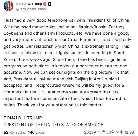 트럼프 대통령은 이날 자신의 소셜 미디어인 트루스 소셜에 이렇게 적으며 "우크라이나-러시아 상황과 펜타닐 문제, 대두와 기타 농산물 등 다양한 주제를 논의했다"고 설명했다.