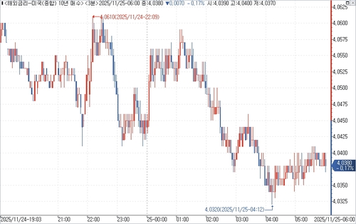연합인포맥스의 해외금리 일중 화면(화면번호 6532)에 따르면 24일(미국 동부시간) 오후 3시 현재 뉴욕 채권시장에서 10년물 국채금리는 직전 거래일 오후 3시 기준가 대비 2.60bp 내린 4.0370%에 거래됐다. 10년물 금리는 지난달 하순 이후 최저치로 후퇴했다.
