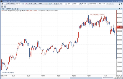 테슬라는 전 거래일 대비 6.82% 오른 417.78달러에 장을 마감했다.