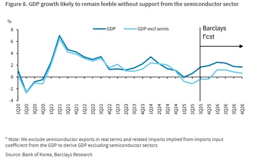바클레이즈는 올해 성장률을 1.1%, 내년 성장률을 2.1%로 내다봤다. 다만 반도체를 제외한 성장률은 2025년 -0.7%, 2026년 1.1%로 추산했다.
