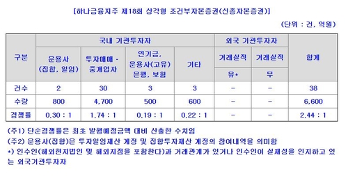 하나금융은 당초 2천700억원을 발행할 예정이었으나 수요가 대거 몰리자 발행 물량을 늘려 4천억원에 3.69% 금리로 발행을 확정했다.