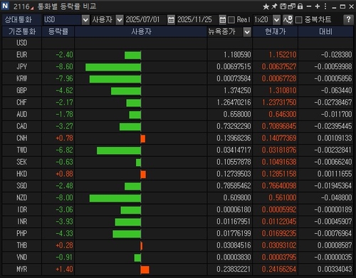 국가 경제에서 수출이 차지하는 비중이 크며 관세율을 낮추는 대신 대규모 대미 투자라는 대가를 지불하게 된 우리나라와 일본, 대만의 통화 약세가 극심한 형국이다.
