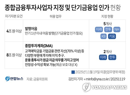 (서울=연합인포맥스) '생산적 금융'의 시대가 본격적으로 열리고 있다. 대형 증권사들이 단기금융업 인가에 이어 종합투자계좌(IMA) 사업자 지위를 확보하면서 한국 금융산업은 또 하나의 전환점을 맞았다. IMA는 원금보전 장치를 갖추면서도 예금과 경쟁할 수 있는 중수익상품으로 설계된다. 기업금융에 필요한 대규모·장기 자금을 안정적으로 공급할 수 있는 제도적 기반이 될 것으로 보인다. 이는 증권사의 사업확장을 넘어 초대형 투자은행(IB) 모델이 현실화하는 신호탄이다.