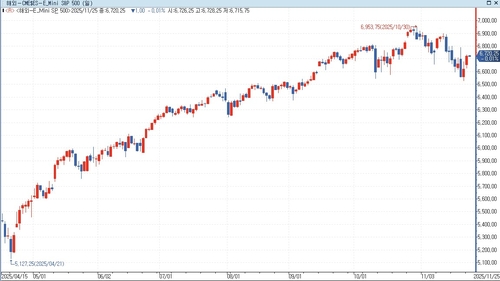 연합인포맥스 지수선물 통합화면(화면번호 6520)에 따르면 한국 시각으로 오전 10시20분 기준 E-미니 S&P500 지수 선물은 전장 대비 0.01% 내린 6,720.25에 거래됐다.
