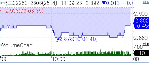 서울 채권시장에 따르면 국고채 3년물 금리는 오전 11시 6분 현재 전 거래일 민간 평가사 금리보다 1.5bp 내린 2.890%를 기록했다.