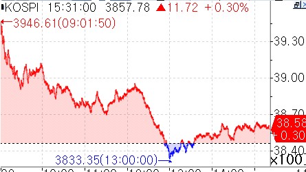 다만 붉은 기둥은 오래가지 못했다. 오전 10시께 매도세가 뚜렷해지면서 상승분을 반납하며 지수가 3,900선 아래로 내려앉았다. 오후 1시부턴 3,855.35까지 밀렸으나 금세 회복했다.