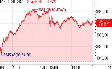 중국 상하이증시는 상승개장 한 뒤 하루종일 상승 흐름을 나타냈다.