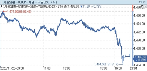 25일 외환시장에서 달러-원 환율은 오후 9시 42분 현재 전장 대비 11.60원 하락한 1,465.50원으로 나타났다.