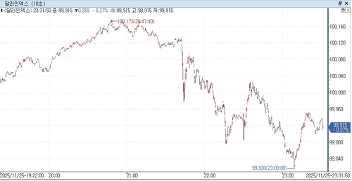 달러인덱스는 미 국채 금리 하락과 맞물려 장중 99.828까지 굴러떨어지기도 했다.