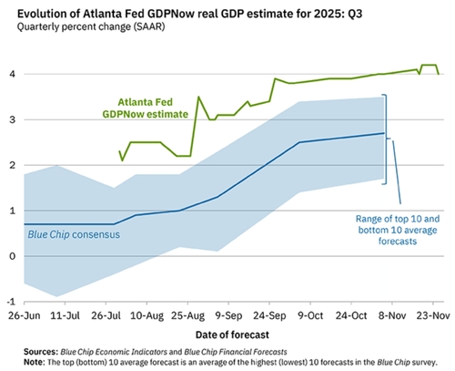 (서울=연합인포맥스) 김성진 기자 = 미국의 경제성장률을 실시간으로 추정하는 애틀랜타 연방준비은행의 'GDP 나우(now)' 모델이 25일(현지시간) 지난 3분기 성장률을 전기대비 연율 환산 기준 4.0%로 제시했다.