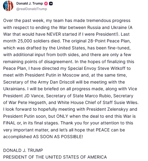 트럼프 대통령은 "평화안을 최종적으로 확정하기 위한 노력의 하나로, 나는 스티브 위트코프 (중동)특사에게 모스크바에서 (블라디미르) 푸틴 (러시아) 대통령을 만나도록 지시했고, 동시에 육군장관 댄 드리스콜은 우크라이나 측과 만날 예정"이라고 설명했다.