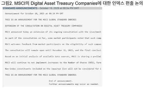 MSCI는 12월 31일까지 의견수렴을 거쳐 2026년 1월 15일 결과를 발표할 예정이다. 따라서 이와 관련된 불확실성은 여전히 남아있고 과거 MSCI의 인덱스 편출 논의 사례들에 비추어볼 때 실제 스트래티지가 인덱스에서 제외될 가능성이 높다는 의견도 존재한다.