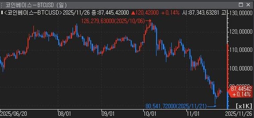 26일 연합인포맥스(화면번호 2521)에 따르면 전일 비트코인 가격은 장 중 한때 2.4% 하락한 86,083.59달러까지 밀렸다. 지난 10월 사상 최고치인 126,279.63달러 대비로는 31% 이상 급락한 셈이다.